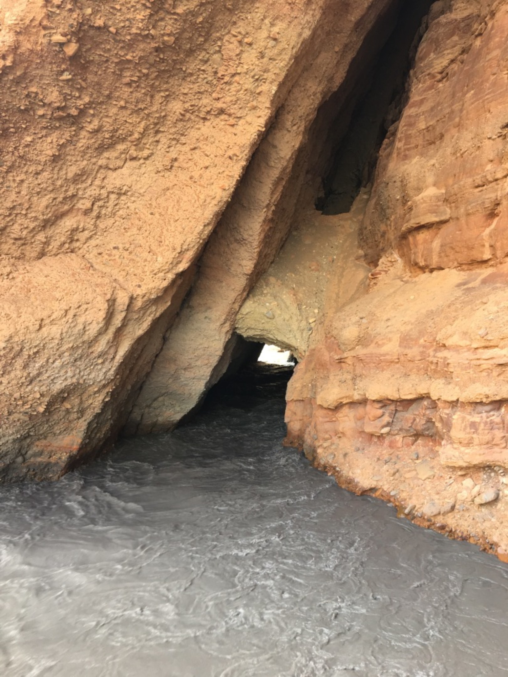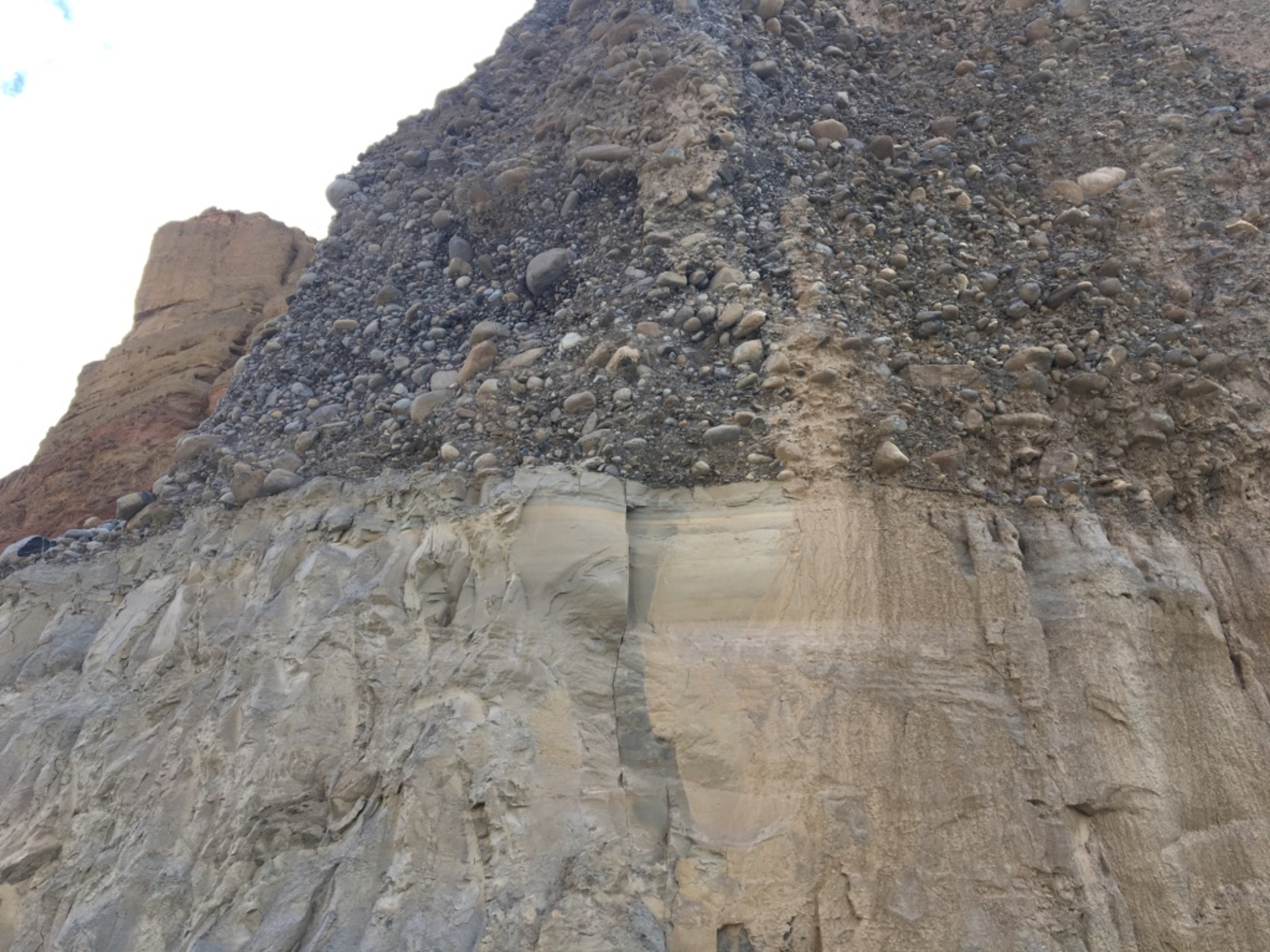 I saw this interesting geological feature from the face of a ten story hill that has been cleaved to make the road. Clay like deposits at the bottom, followed by rounded rocks(indicative of exposure to fast flowing water) and earth on top. You can see Chaile at the top of the slope(loose rocks slope it turns out) in the middle of the second picture. The picture with the 4x4's parked is where the Kali Gandaki river concentrates into a fast torrent going through a hill. It is also the start/end point for 4x4 transportation(the only kind of public transportation available really) going to different villages. You can see the hole in the hill a few pictures later.