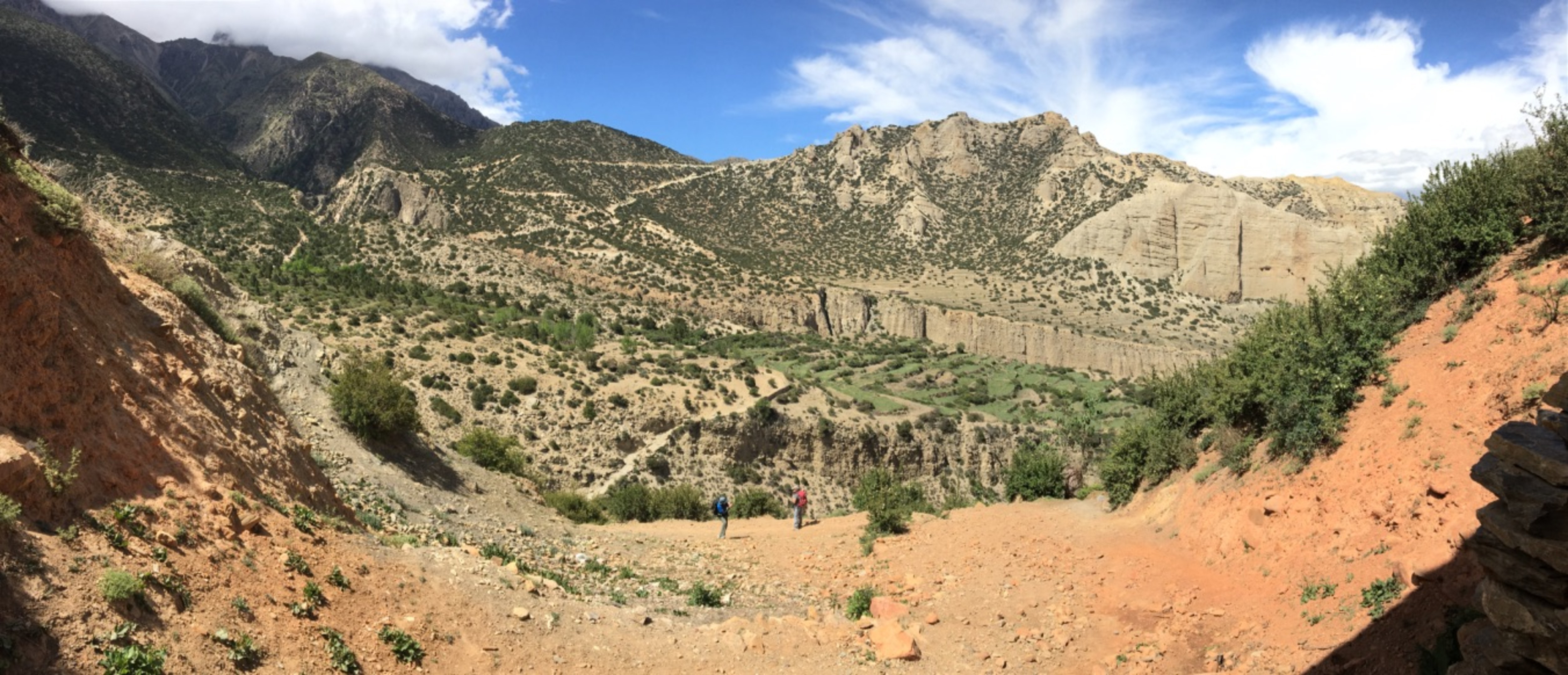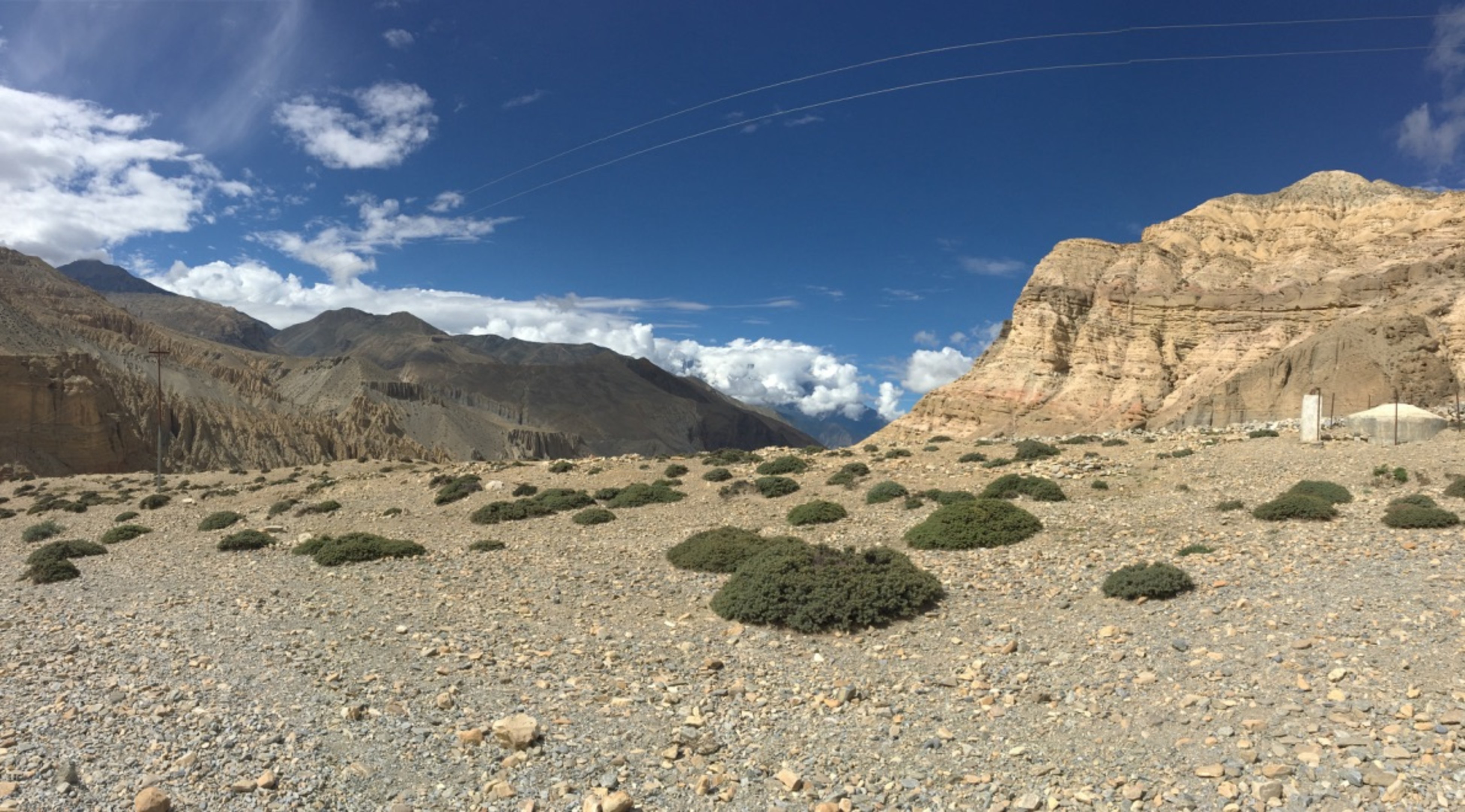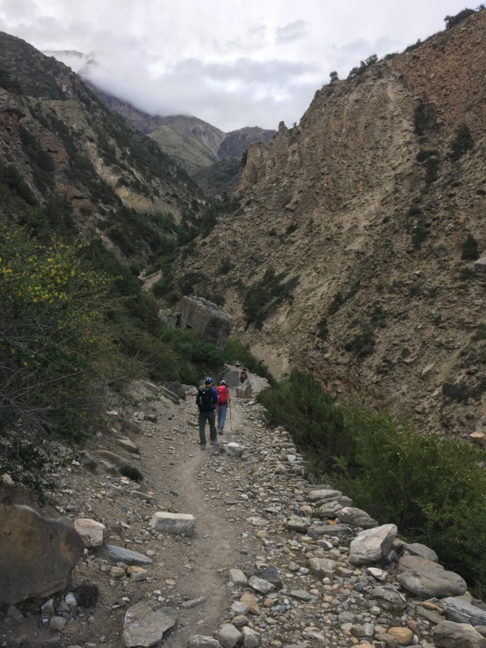 The loose rock climb up to Chaile. Looking down at Kali Gandaki halfway up the slope, you can see how the water is concentrating to the left of the pictures(just follow the dark grey). You can also see the river bed is very wide although the actual water courseway is little. Wonder how it looks when there is a lot more water flowing.