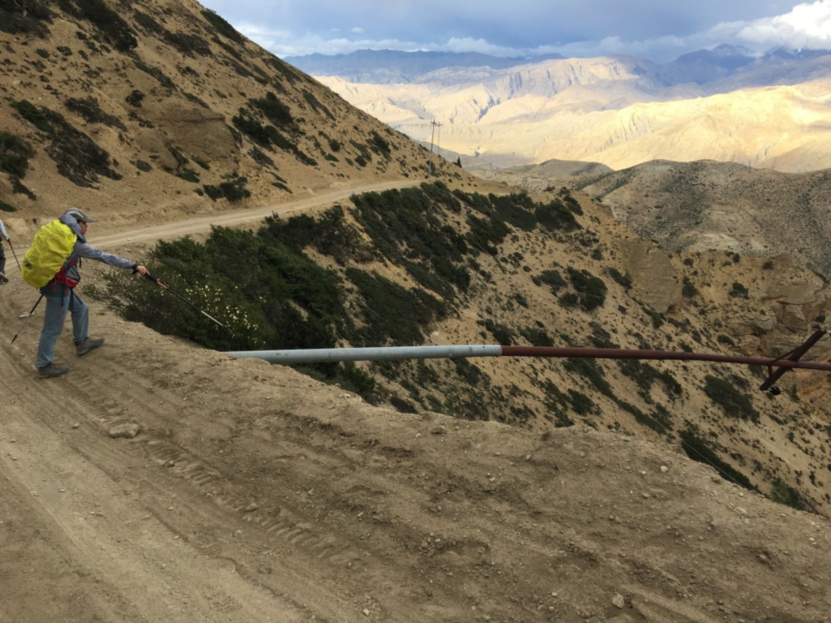 The ubiquitous prayer wheels as we left our lunch stop. For some reason, this village had a structural village entrance on the north side where it descends sharply to a river. You can see its a pretty nice view from the village entrance. You also see the trail we have to go back up on, on the other side of the river. Welcome to Nepali flat.